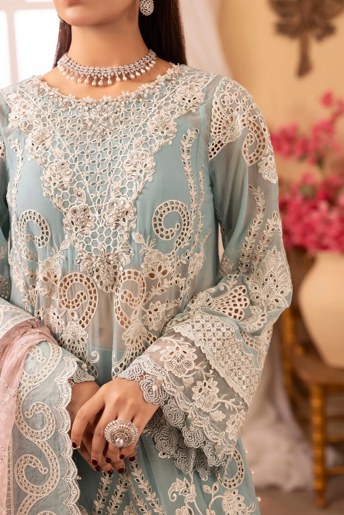 • Luxury Embroidered & Hand Embellished Chiffon Shirt 1-Pc • Luxury Embroidered & Printed Chiffon Dupatta 1-Pc • Dyed Raw Silk Trouser • (Include Embroidered Accessories)
