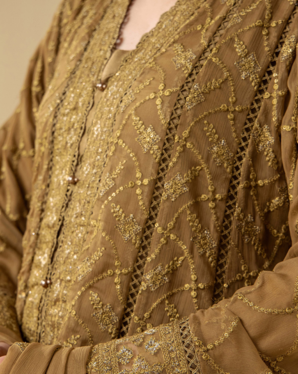 Be the first to review “Adan’s Libas | Chiffon Gown vol-5 Stitched “Brown” Formal Festive Wear | D2-3pc”