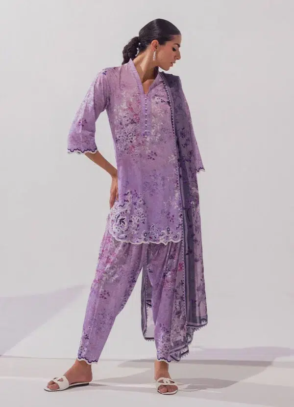 The Purple Cotton 3PC Embroidered outfit from our Spring Collection features a printed shirt, three quarter sleeves, paired with a cutwork embroidered shalwar & dupatta.